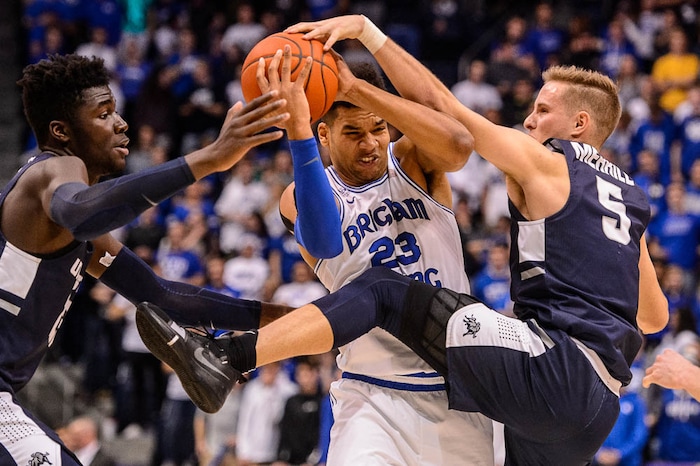 Brigham Young Cougars forward Yoeli Childs (23) defended by Utah State Aggies center Neemias Queta (23) and Utah State Aggies guard Sam Merrill (5) as BYU hosts Utah State, NCAA basketball in Provo on Wednesday Dec. 5, 2018.