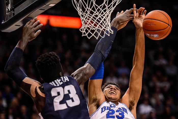 Utah State Aggies center Neemias Queta (23) blocks a shot by Brigham Young Cougars forward Yoeli Childs (23) as BYU hosts Utah State, NCAA basketball in Provo on Wednesday Dec. 5, 2018.
