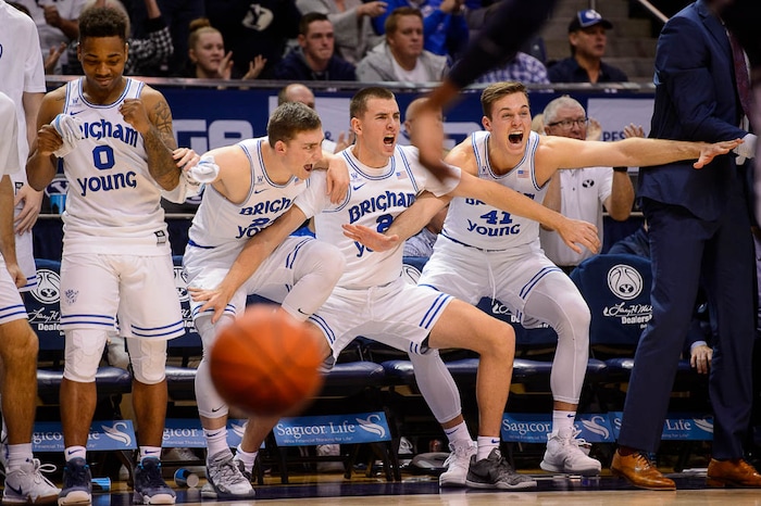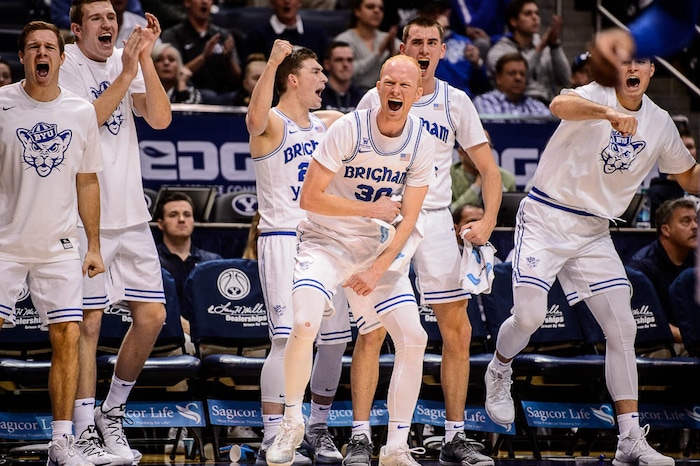 The BYU bench, including Brigham Young Cougars guard TJ Haws (30), celebrate a foul as BYU hosts Utah State, NCAA basketball in Provo on Wednesday Dec. 5, 2018.
