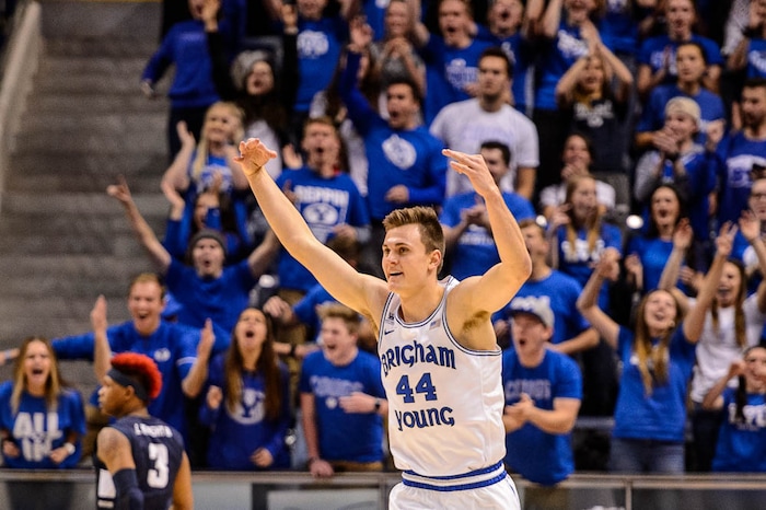 Brigham Young Cougars guard Connor Harding (44) celebrates a three-pointer as BYU hosts Utah State, NCAA basketball in Provo on Wednesday Dec. 5, 2018.