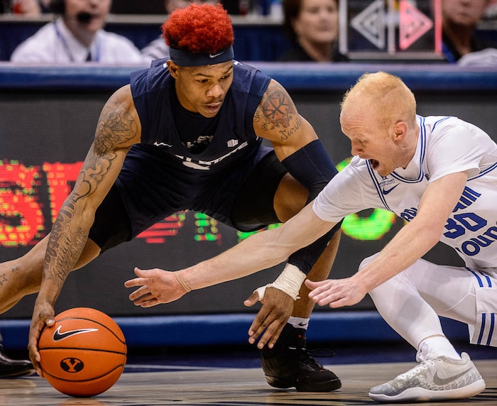 Brigham Young Cougars guard TJ Haws (30) dives in to try to take the ball from Utah State Aggies guard John Knight III (3) as BYU hosts Utah State, NCAA basketball in Provo on Wednesday Dec. 5, 2018.