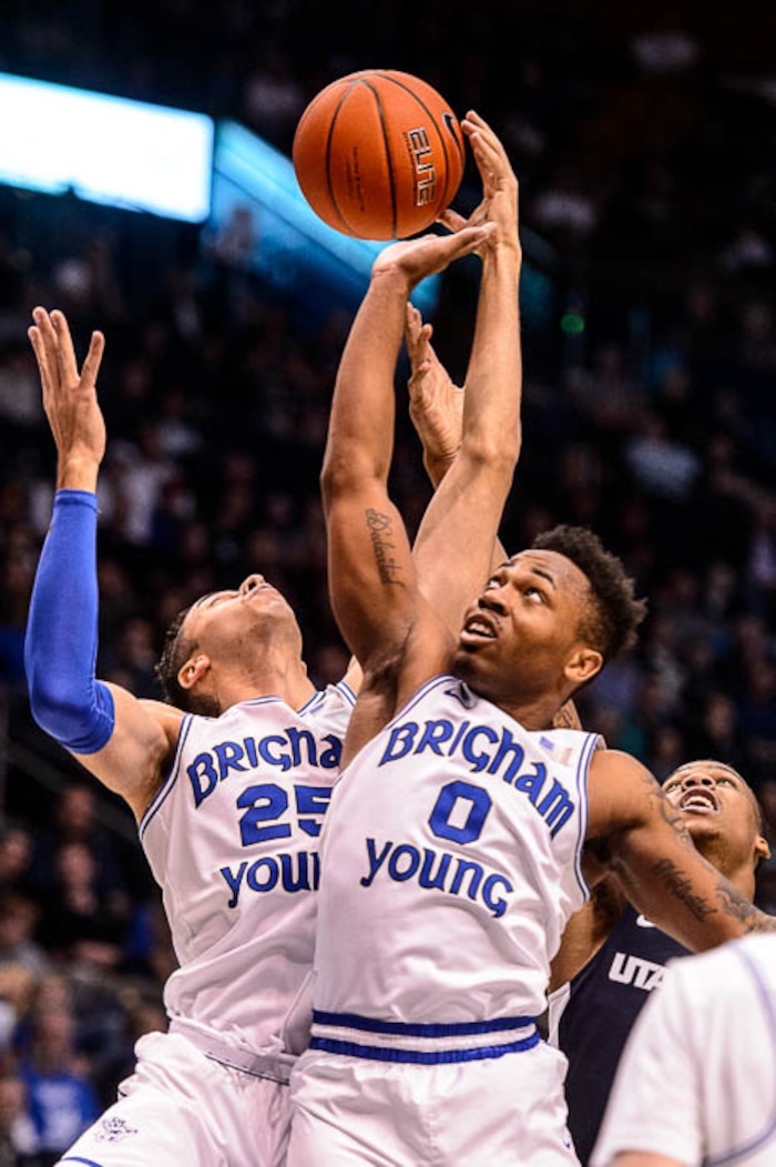 Brigham Young Cougars forward Gavin Baxter (25) and Brigham Young Cougars guard Jahshire Hardnett (0) rebound as BYU hosts Utah State, NCAA basketball in Provo on Wednesday Dec. 5, 2018.