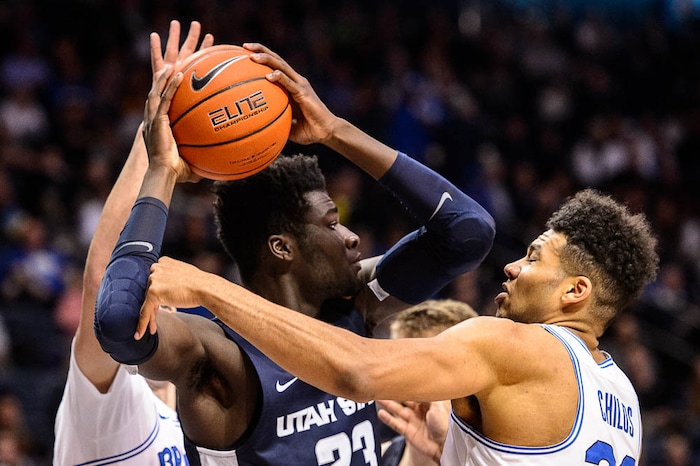 Utah State Aggies center Neemias Queta (23) defended by Brigham Young Cougars guard Zac Seljaas (2) and Brigham Young Cougars forward Yoeli Childs (23) as BYU hosts Utah State, NCAA basketball in Provo on Wednesday Dec. 5, 2018.