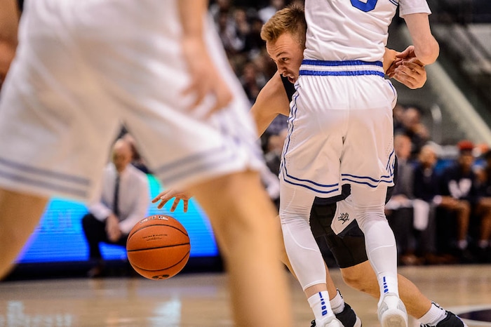 Utah State Aggies guard Crew Ainge (4) runs into Brigham Young Cougars guard TJ Haws (30) as BYU hosts Utah State, NCAA basketball in Provo on Wednesday Dec. 5, 2018.