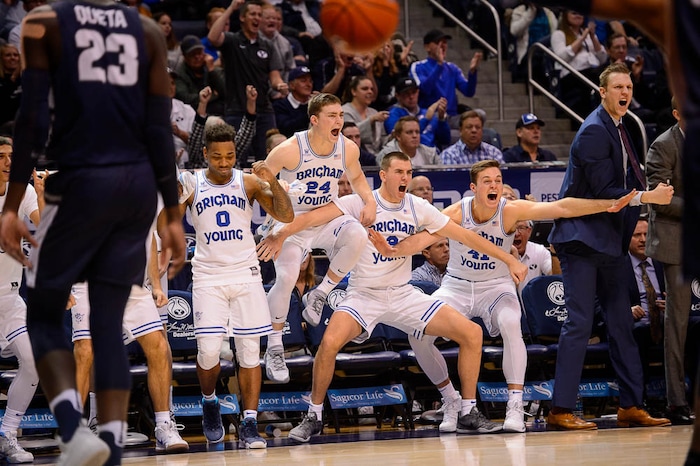 BYU's bench celebrates a foul as BYU hosts Utah State, NCAA basketball in Provo on Wednesday Dec. 5, 2018.