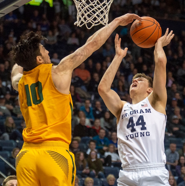 (Rick Egan | The Salt Lake Tribune) San Francisco Dons forward Matt McCarthy (10) blocks a shot by Brigham Young Cougars guard Connor Harding (44), in WCC basketball action between Brigham Young Cougars and San Francisco Dons, at the Marriott Center, Thursday, February 21, 2018.