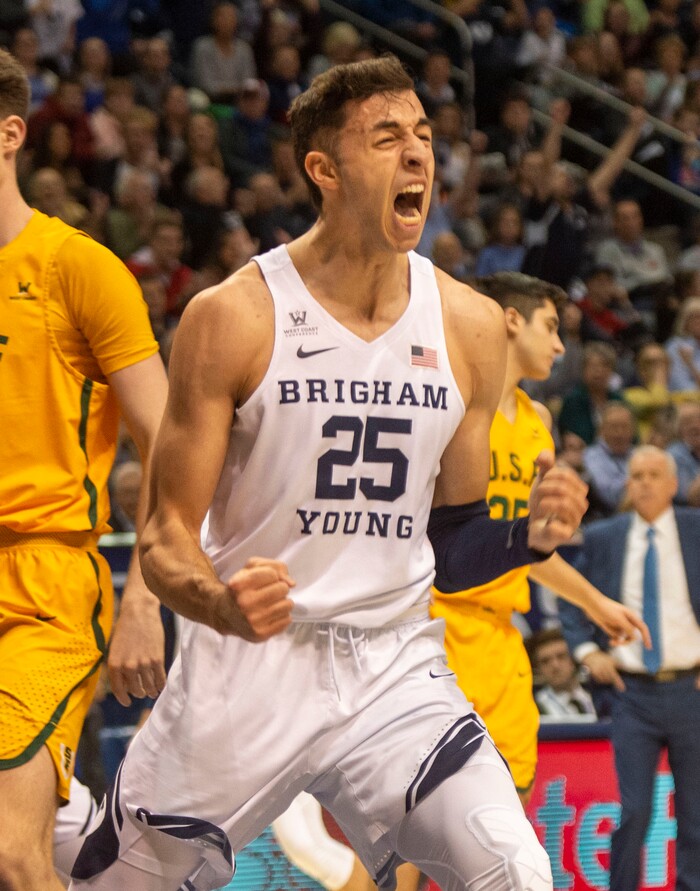 (Rick Egan | The Salt Lake Tribune) Brigham Young Cougars forward Gavin Baxter (25) reacts as the Brigham Young Cougars extend their lead early in the second half, in WCC basketball action between Brigham Young Cougars and San Francisco Dons, at the Marriott Center, Thursday, February 21, 2018.