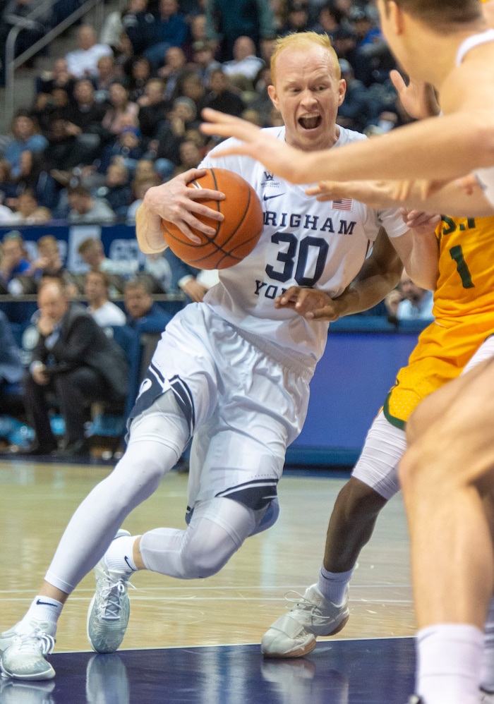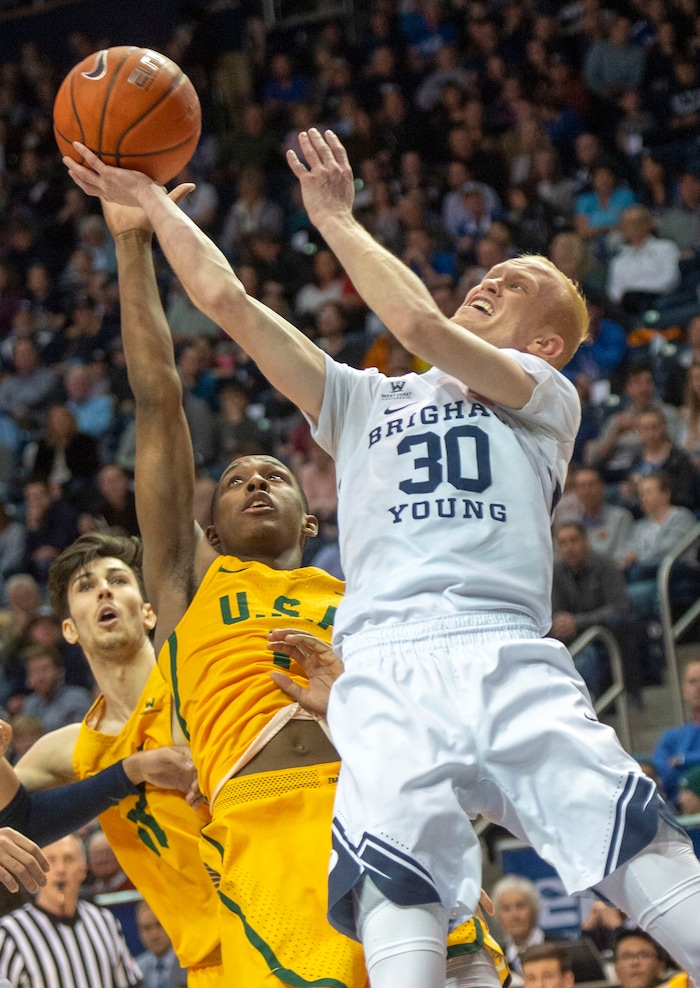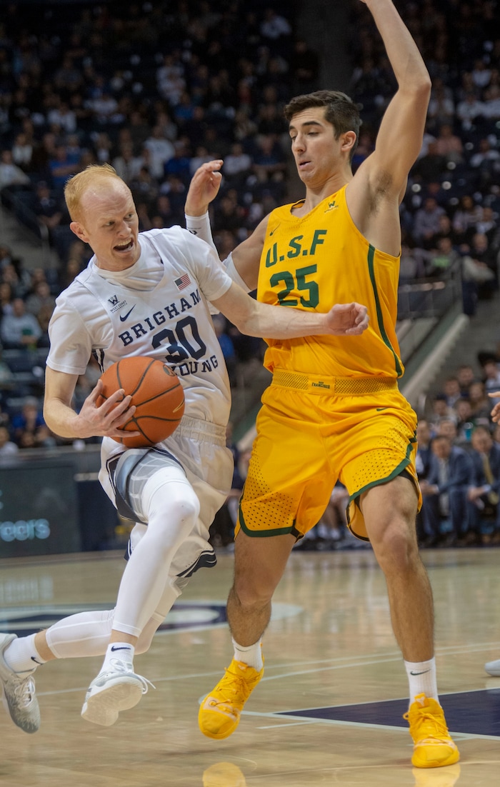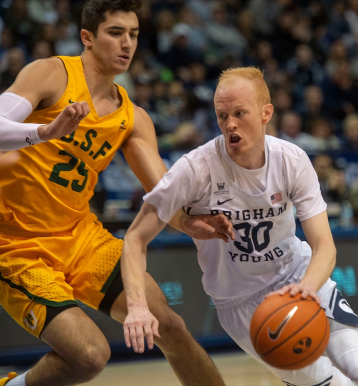 (Rick Egan | The Salt Lake Tribune) Brigham Young Cougars guard TJ Haws (30) takes the ball inside as San Francisco Dons guard Jordan Ratinho (25) defends, in WCC basketball action at the Marriott Center, Thursday, February 21, 2018.