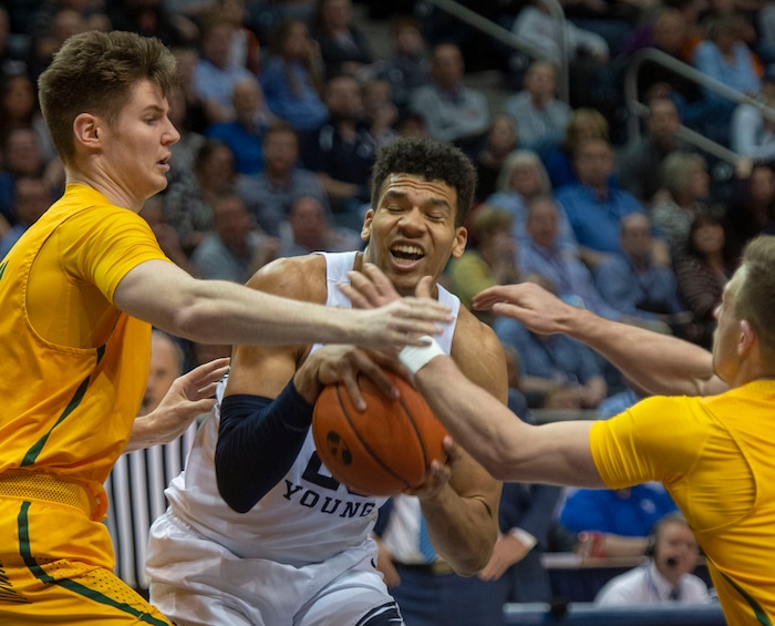 (Rick Egan | The Salt Lake Tribune) Brigham Young Cougars forward Yoeli Childs (23) is doubled teamed by the San Francisco Dons, in WCC basketball action at the Marriott Center, Thursday, February 21, 2018.