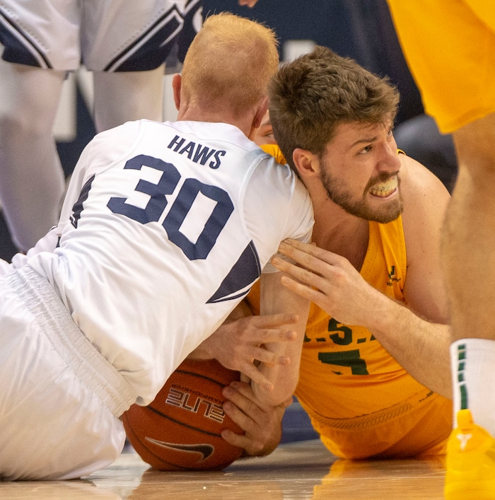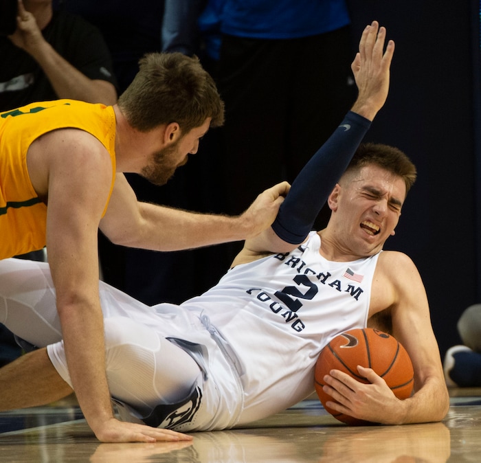 (Rick Egan | The Salt Lake Tribune) Brigham Young Cougars guard TJ Haws (30), reacts after a hard foul, in WCC basketball action between Brigham Young Cougars and San Francisco Dons, at the Marriott Center, Thursday, February 21, 2018.