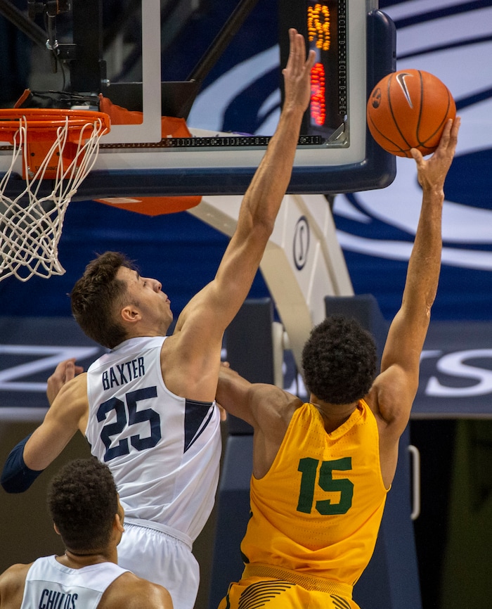 (Rick Egan | The Salt Lake Tribune) Brigham Young Cougars forward Gavin Baxter (25) blocks a shot by San Francisco Dons guard Charles Minlend (14), in WCC basketball action at the Marriott Center, Thursday, February 21, 2018.