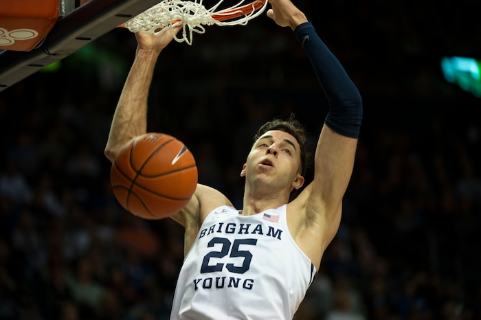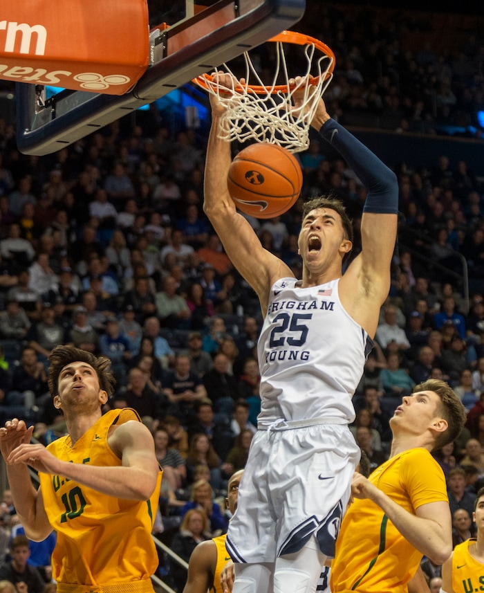 (Rick Egan | The Salt Lake Tribune) Brigham Young forward Gavin Baxter (25) dunks the ball for the Cougars, in WCC basketball action between Brigham Young Cougars and San Francisco Dons, at the Marriott Center, Thursday, February 21, 2018.