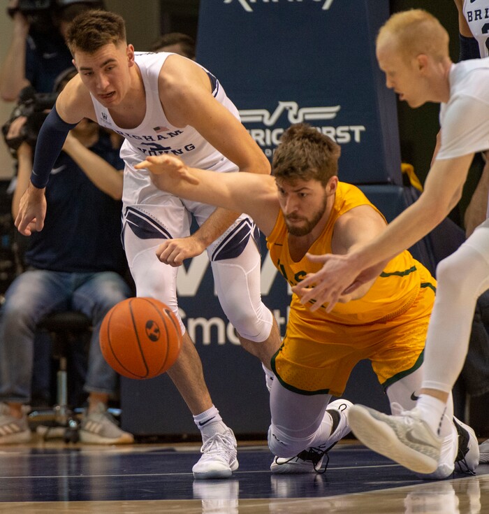 (Rick Egan | The Salt Lake Tribune) Brigham Young Cougars guard Zac Seljaas (2) goes after a loose ball along with San Francisco Dons center Jimbo Lull (5), in WCC basketball action at the Marriott Center, Thursday, February 21, 2018.