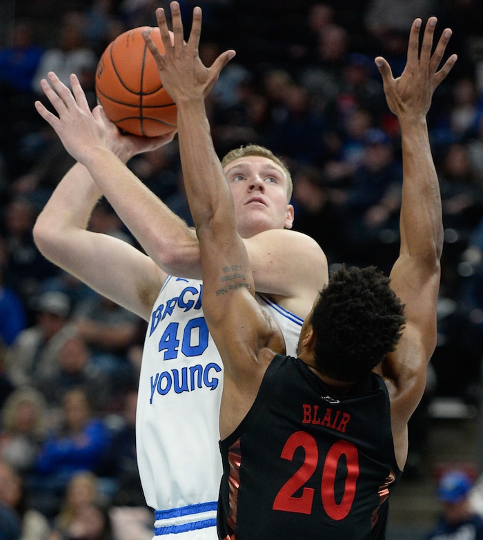 (Francisco Kjolseth | The Salt Lake Tribune) Brigham Young Cougars forward Kolby Lee (40) goes up against UNLV Rebels forward Nick Blair (20) as BYU takes on UNLV in men's NCAA basketball at Vivint Smart Home Arena in Salt Lake City on Sat. Dec. 7, 2019.