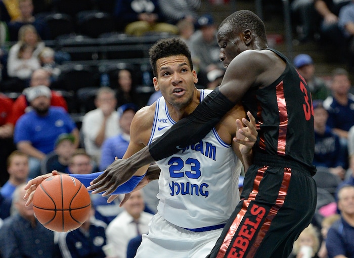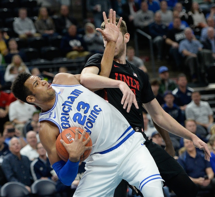 (Francisco Kjolseth | The Salt Lake Tribune) Brigham Young Cougars forward Yoeli Childs (23) gets tangled with UNLV Rebels forward Vitaliy Shibel (22) as BYU takes on UNLV in men's NCAA basketball at Vivint Smart Home Arena in Salt Lake City on Sat. Dec. 7, 2019.