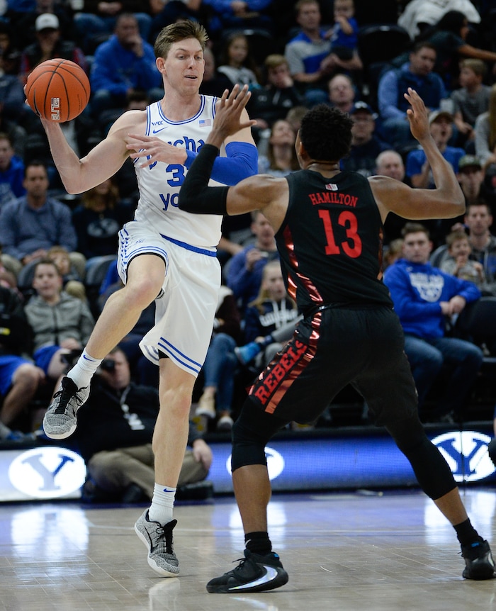 (Francisco Kjolseth | The Salt Lake Tribune) Brigham Young Cougars forward Dalton Nixon (33) throws a pass over UNLV Rebels guard Bryce Hamilton (13) as BYU takes on UNLV in men's NCAA basketball at Vivint Smart Home Arena in Salt Lake City on Sat. Dec. 7, 2019.