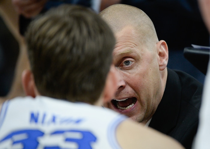 (Francisco Kjolseth | The Salt Lake Tribune) Head coach for BYU Mark Pope yells to his team as BYU takes on UNLV in men's NCAA basketball at Vivint Smart Home Arena in Salt Lake City on Sat. Dec. 7, 2019.