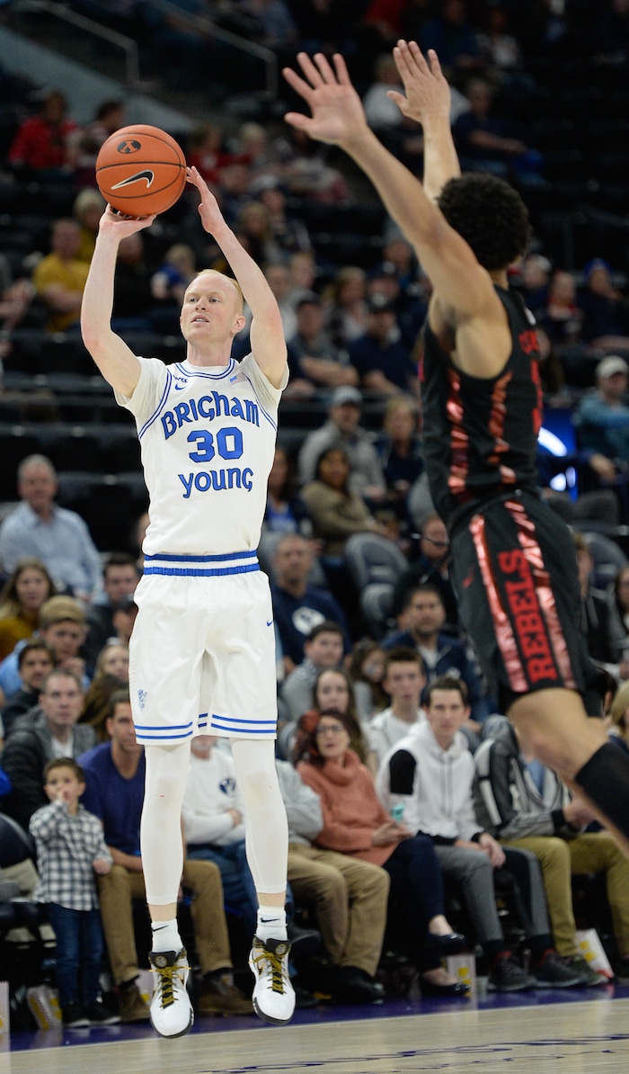 (Francisco Kjolseth | The Salt Lake Tribune) Brigham Young Cougars guard TJ Haws (30) gets the three pointer as BYU takes on UNLV in men's NCAA basketball at Vivint Smart Home Arena in Salt Lake City on Sat. Dec. 7, 2019.