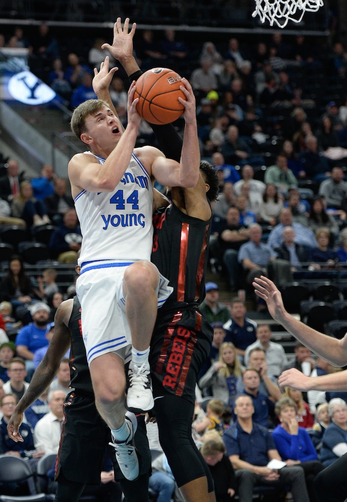 (Francisco Kjolseth | The Salt Lake Tribune) Brigham Young Cougars guard Connor Harding (44) manages to push past UNLV Rebels guard Bryce Hamilton (13) as BYU takes on UNLV in men's NCAA basketball at Vivint Smart Home Arena in Salt Lake City on Sat. Dec. 7, 2019.