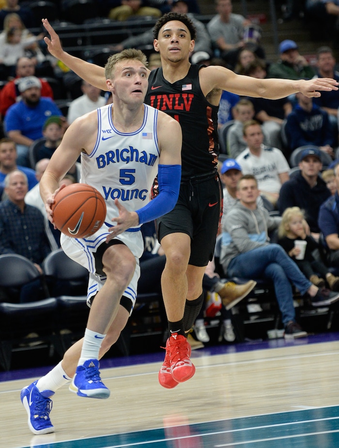 (Francisco Kjolseth | The Salt Lake Tribune) Brigham Young Cougars guard Jake Toolson (5) sails past UNLV Rebels forward Vitaliy Shibel (22) as BYU takes on UNLV in men's NCAA basketball at Vivint Smart Home Arena in Salt Lake City on Sat. Dec. 7, 2019.