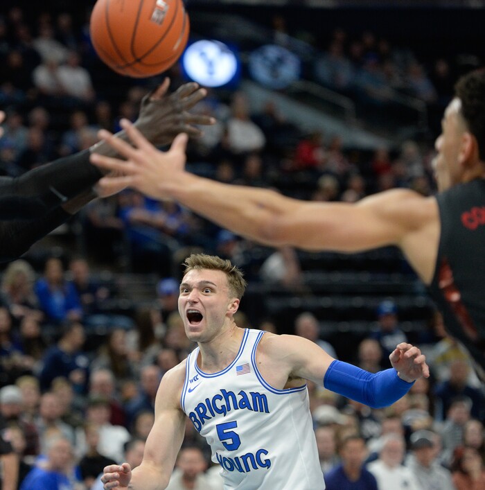 (Francisco Kjolseth | The Salt Lake Tribune) Brigham Young Cougars guard Jake Toolson (5) sees his pass get clipped as BYU takes on UNLV in men's NCAA basketball at Vivint Smart Home Arena in Salt Lake City on Sat. Dec. 7, 2019.