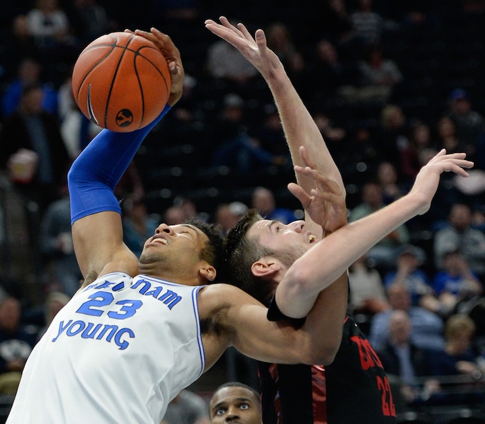 (Francisco Kjolseth | The Salt Lake Tribune) Brigham Young Cougars forward Yoeli Childs (23) gets the rebound as BYU takes on UNLV in men's NCAA basketball at Vivint Smart Home Arena in Salt Lake City on Sat. Dec. 7, 2019.