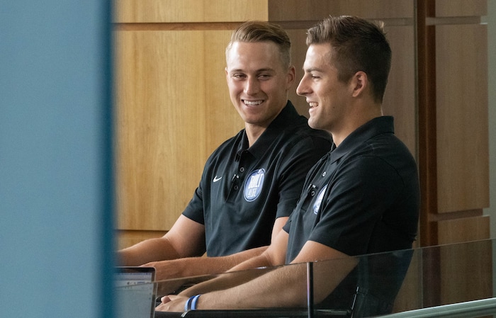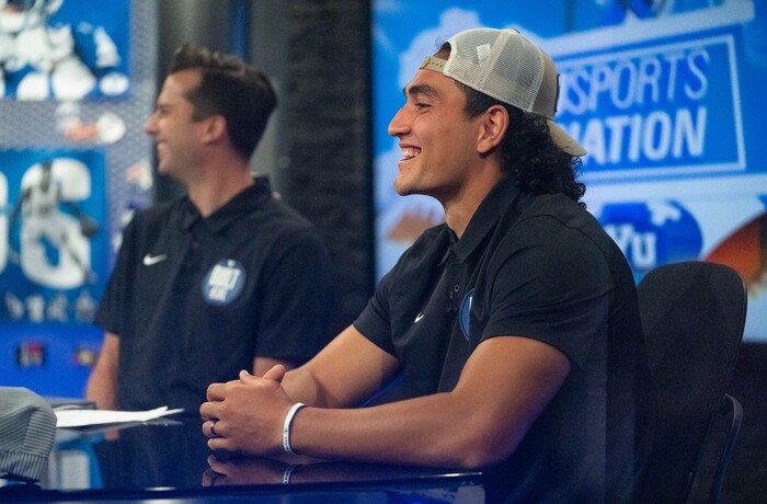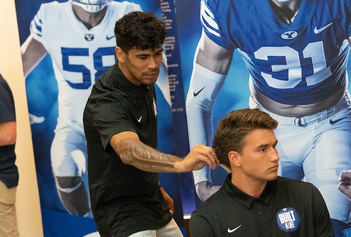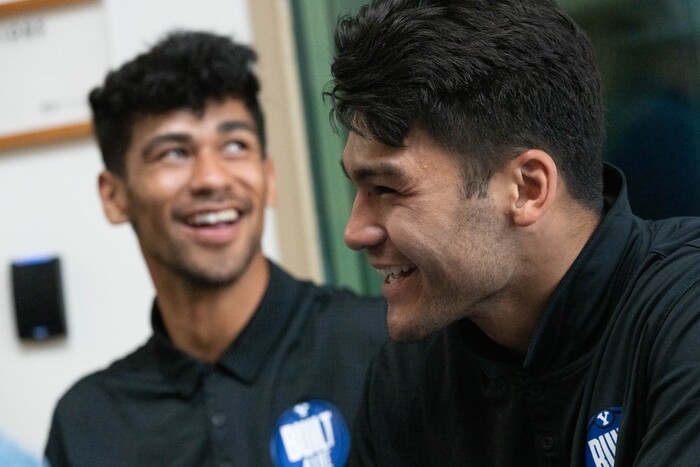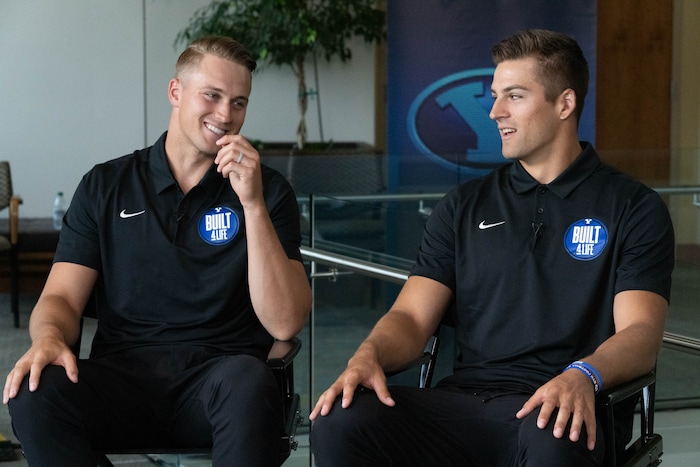 (Francisco Kjolseth | The Salt Lake Tribune) Brothers Baylor Romney, left, and Gunner argue over the details of family stories being competitive with one another as they join BYU football coaches, players and staff participating in BYU Football Media Day in the BYU Broadcasting Building in Provo on Thursday, June 17, 2021.