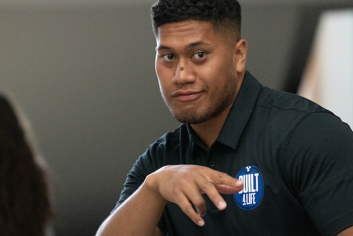 (Francisco Kjolseth | The Salt Lake Tribune) Defensive lineman Uriah Leiataua joins BYU football coaches, players and staff participating in BYU football media day in the BYU Broadcasting Building in Provo on Thursday, June 17, 2021.