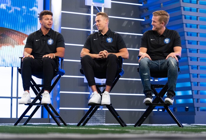 (Francisco Kjolseth | The Salt Lake Tribune) BYU quarterbacks, from left, Jaren Hall, Baylor Romney and Jacob Conover answer questions during BYU Football Media Day at the BYU Broadcasting Building in Provo on Thursday, June 17, 2021