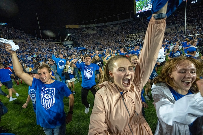 BYU fans storm the field as the Brigham Young Cougars defeat the Utah Utes 26-17, at Lavell Edwards Stadium in Provo, on Saturday, Sept. 11, 2021.