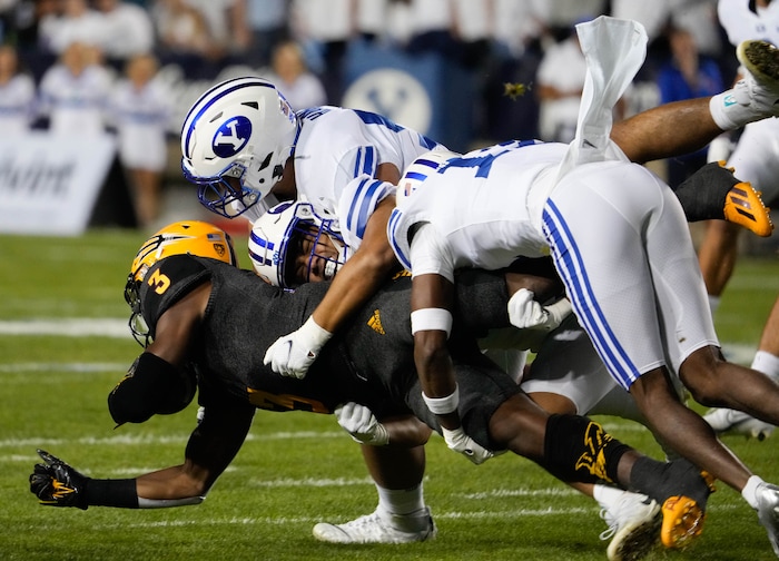 (Francisco Kjolseth | The Salt Lake Tribune) Arizona State Sun Devils running back Rachaad White (3) is taken down by BYU in football action between the Brigham Young Cougars and the Arizona State Sun Devils at LaVell Edwards Stadium in Provo, on Saturday, Sept. 18, 2021.