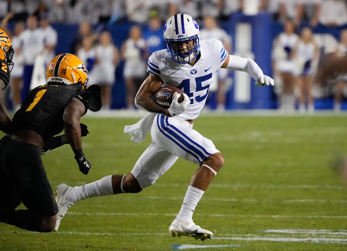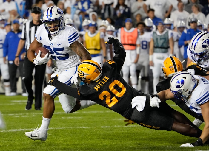 (Francisco Kjolseth | The Salt Lake Tribune) Brigham Young Cougars defensive back Talan Alfrey (25) looks for an opening through the Arizona State Sun Devils defense during game action at LaVell Edwards Stadium in Provo, on Saturday, Sept. 18, 2021.