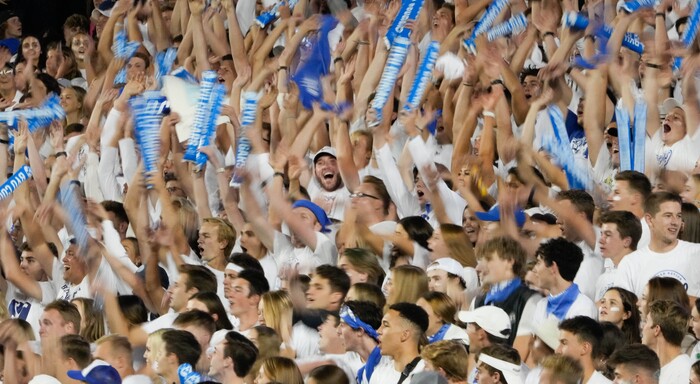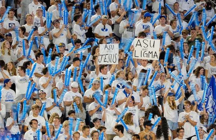 (Francisco Kjolseth | The Salt Lake Tribune) The student section cheers on the Brigham Young Cougars as they get ready to take on the Arizona State Sun Devils at LaVell Edwards Stadium in Provo, on Saturday, Sept. 18, 2021.