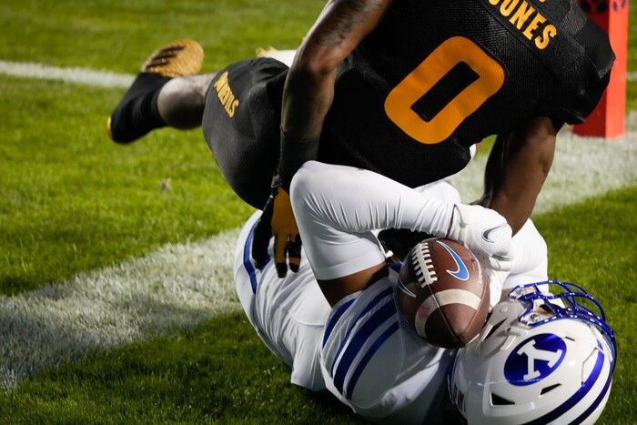 (Francisco Kjolseth | The Salt Lake Tribune) Brigham Young Cougars defensive back D'Angelo Mandell (5) breaks up a pass intended for Arizona State Sun Devils wide receiver Ricky Pearsall (19) in football action between the Brigham Young Cougars and the Arizona State Sun Devils at LaVell Edwards Stadium in Provo, on Saturday, Sept. 18, 2021.