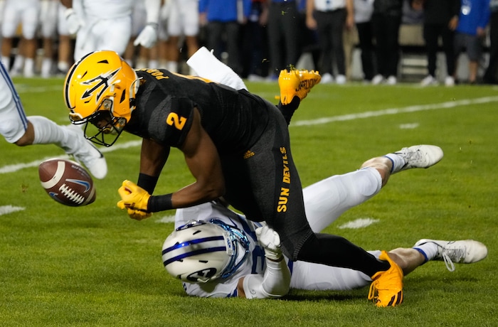 (Francisco Kjolseth | The Salt Lake Tribune) Arizona State Sun Devils wide receiver Geordon Porter (2) is taken down by Brigham Young Cougars wide receiver Talmage Gunther to force a fumble on a kick return at the start of the game in game action between the Brigham Young Cougars and the Arizona State Sun Devils at LaVell Edwards Stadium in Provo, on Saturday, Sept. 18, 2021.