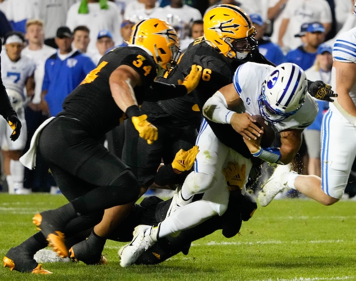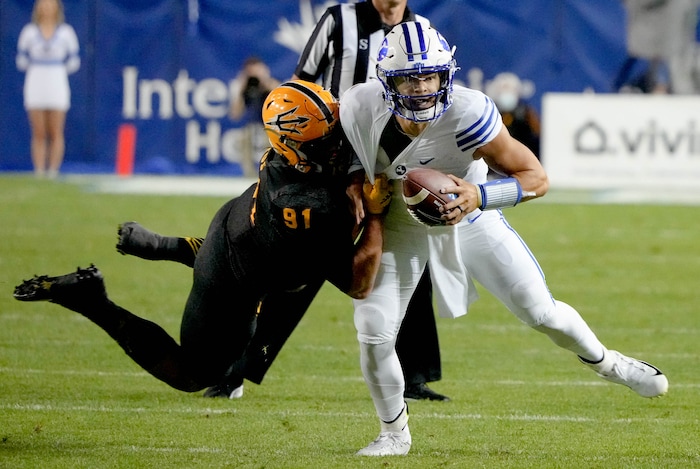 (Francisco Kjolseth | The Salt Lake Tribune) Brigham Young Cougars quarterback Jaren Hall (3) is turned into a pretzel by the Arizona State Sun Devils in the final minutes of play at LaVell Edwards Stadium in Provo, on Saturday, Sept. 18, 2021.