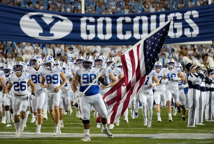 (Francisco Kjolseth | The Salt Lake Tribune) The Brigham Young Cougars get ready to take on the Arizona State Sun Devils at LaVell Edwards Stadium in Provo, on Saturday, Sept. 18, 2021.