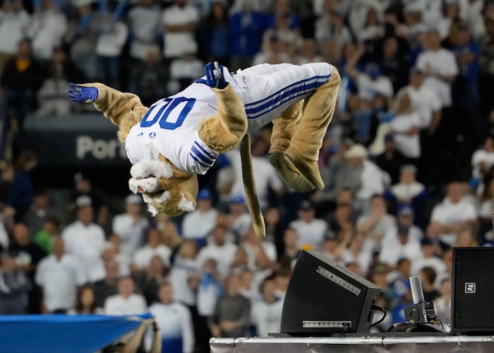 (Francisco Kjolseth | The Salt Lake Tribune) Cosmo shows off his athleticism as Brigham Young Cougar fans cheer on their team against the Arizona State Sun Devils at LaVell Edwards Stadium in Provo, on Saturday, Sept. 18, 2021.