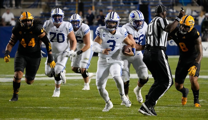 (Francisco Kjolseth | The Salt Lake Tribune) Brigham Young Cougars quarterback Jaren Hall (3) runs the ball as a referee tries to stay out of the way in football action between the Brigham Young Cougars and the Arizona State Sun Devils at LaVell Edwards Stadium in Provo, on Saturday, Sept. 18, 2021.