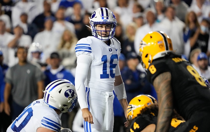 (Francisco Kjolseth | The Salt Lake Tribune) Brigham Young Cougars quarterback Baylor Romney (16) takes over in the final minutes of the game after quarterback Jaren Hall (3) was injured during play against the Arizona State Sun Devils at LaVell Edwards Stadium in Provo, on Saturday, Sept. 18, 2021.