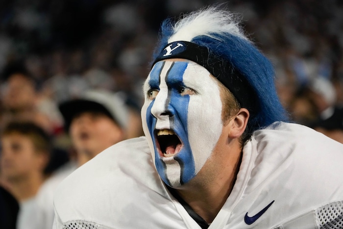 (Francisco Kjolseth | The Salt Lake Tribune) Brigham Young Cougar fans cheer on the Cougars against the Arizona State Sun Devils at LaVell Edwards Stadium in Provo, on Saturday, Sept. 18, 2021.