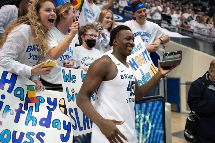 (Francisco Kjolseth | The Salt Lake Tribune) The student section celebrates the birthday of Brigham Young Cougars forward Fousseyni Traore (45) following their game against the Portland Pilots, at the Marriott Center, on Saturday, January 22, 2022.