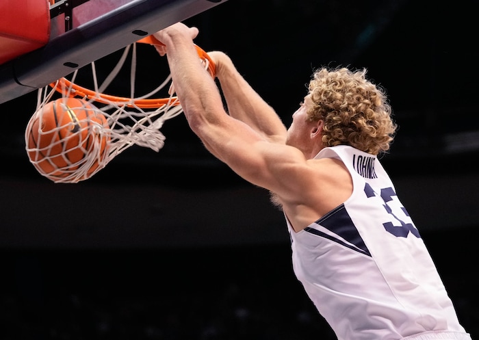 (Francisco Kjolseth | The Salt Lake Tribune) Brigham Young Cougars forward Caleb Lohner (33) dunks the ball in WCC basketball action between the Brigham Young Cougars and the Portland Pilots, at the Marriott Center, on Saturday, January 22, 2022.