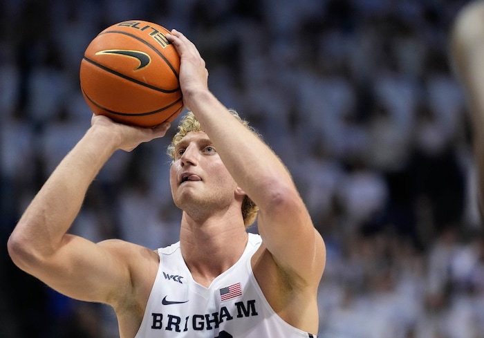 (Francisco Kjolseth | The Salt Lake Tribune) Brigham Young Cougars forward Caleb Lohner (33) shoots a free throw in WCC basketball action between the Brigham Young Cougars and the Portland Pilots, at the Marriott Center, on Saturday, January 22, 2022.