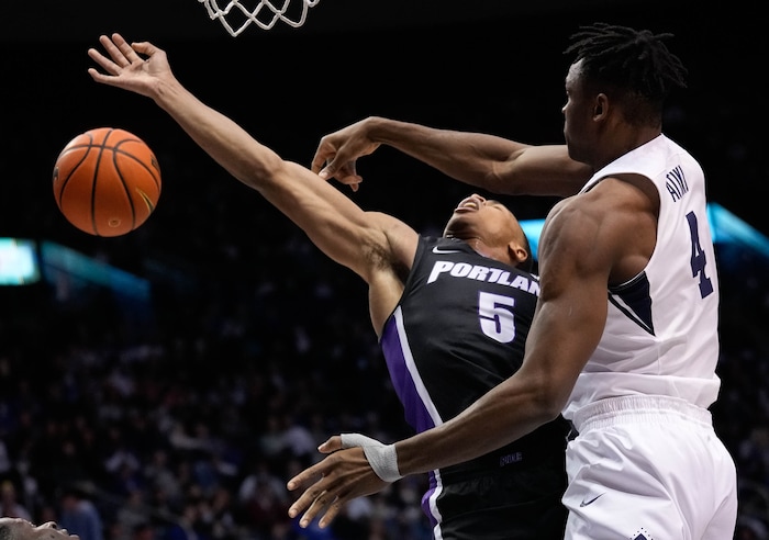 (Francisco Kjolseth | The Salt Lake Tribune) Brigham Young Cougars forward Atiki Ally Atiki (4) puts the block on Portland Pilots guard Chris Austin (5) in WCC basketball action between the Brigham Young Cougars and the Portland Pilots, at the Marriott Center, on Saturday, January 22, 2022.