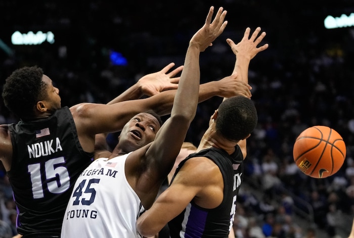 (Francisco Kjolseth | The Salt Lake Tribune) Brigham Young Cougars forward Fousseyni Traore (45) battles Portland Pilots guard Chika Nduka (15) and Portland Pilots guard Chris Austin (5) in WCC basketball action between the Brigham Young Cougars and the Portland Pilots, at the Marriott Center, on Saturday, January 22, 2022.