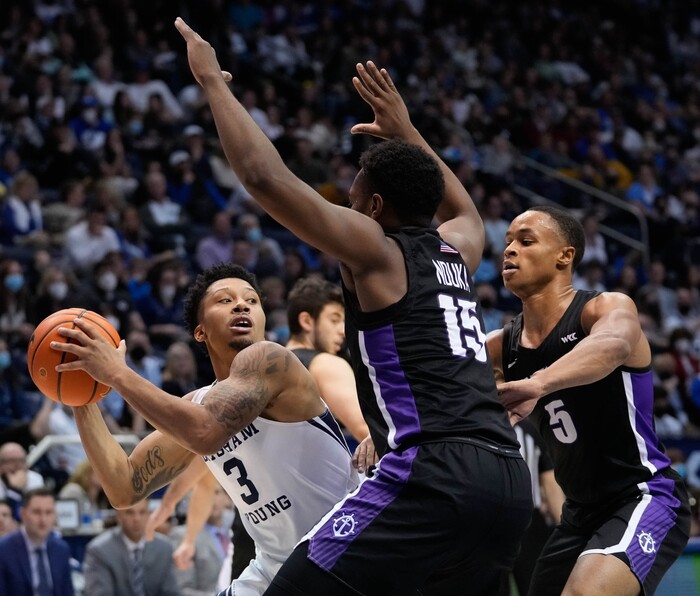 (Francisco Kjolseth | The Salt Lake Tribune) Brigham Young Cougars guard Te'Jon Lucas (3) tries to find and open teammate past Portland Pilots guard Chika Nduka (15) and Portland Pilots guard Chris Austin (5) in WCC basketball action between the Brigham Young Cougars and the Portland Pilots, at the Marriott Center, on Saturday, January 22, 2022.