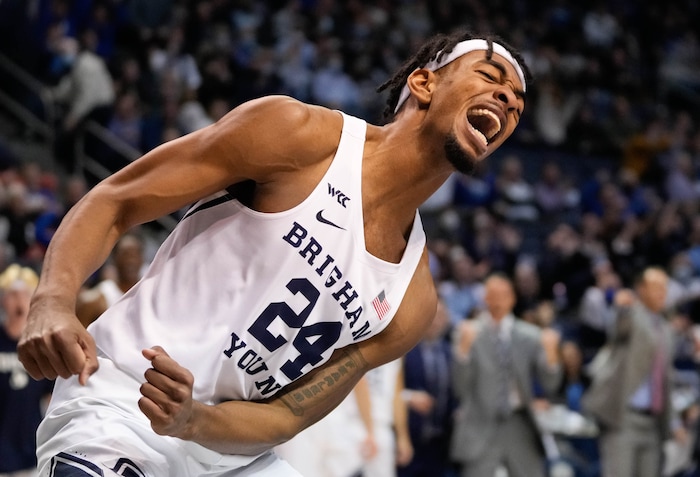 (Francisco Kjolseth | The Salt Lake Tribune) Brigham Young Cougars forward Seneca Knight (24) celebrates a dunk in the final minutes in WCC basketball action between the Brigham Young Cougars and the Portland Pilots, at the Marriott Center, on Saturday, January 22, 2022.