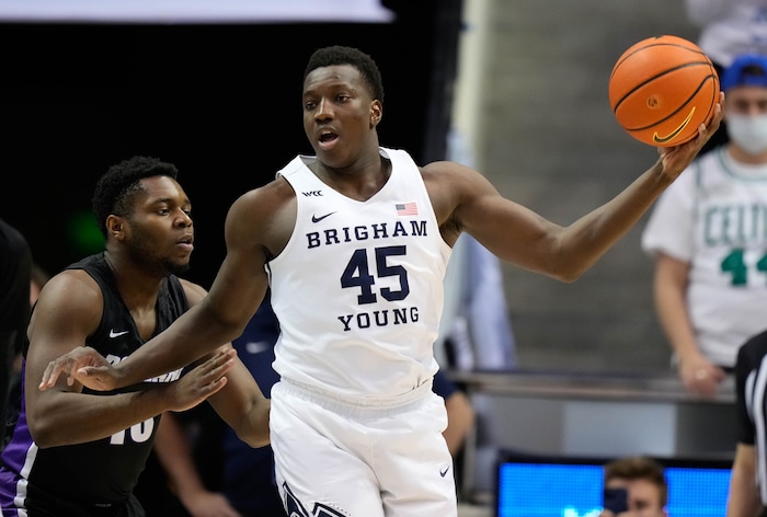 (Francisco Kjolseth | The Salt Lake Tribune) Brigham Young Cougars forward Fousseyni Traore (45) looks for a teammate in WCC basketball action between the Brigham Young Cougars and the Portland Pilots, at the Marriott Center, on Saturday, January 22, 2022.