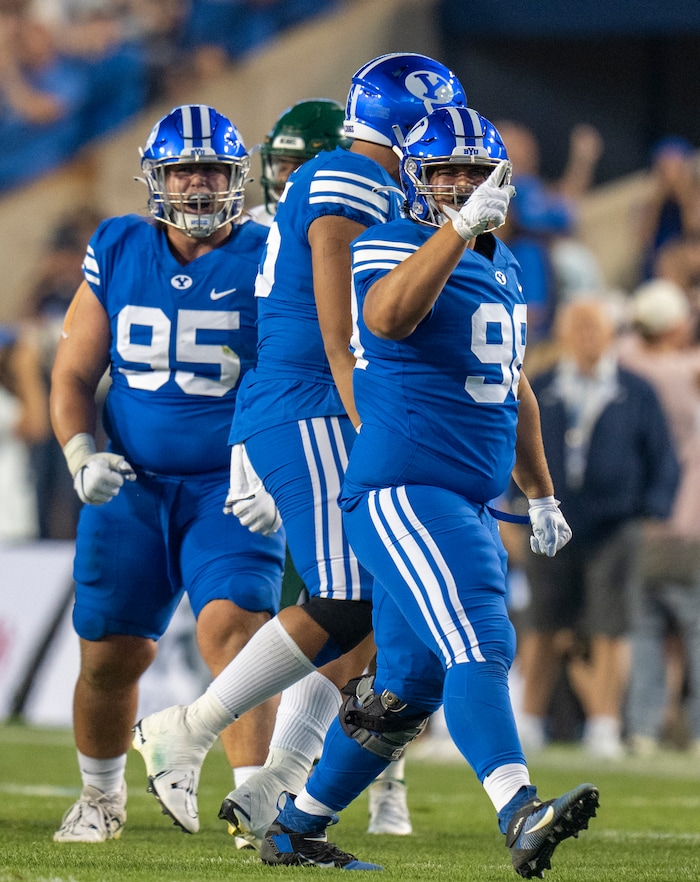 (Rick Egan | The Salt Lake Tribune) Brigham Young Cougars defensive lineman Caden Haws (95) and defensive lineman Gabe Summers (98) celebrates after a quarterback sack, in football action between the Brigham Young Cougars and the Baylor Bears at Lavell Edwards Stadium in Provo, on Saturday, Sept. 10, 2022.